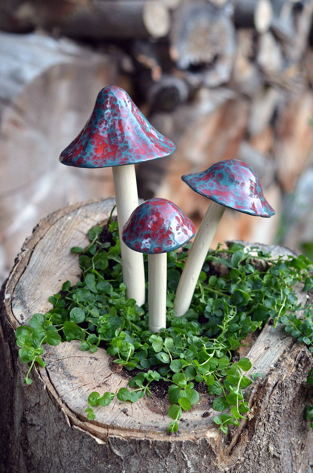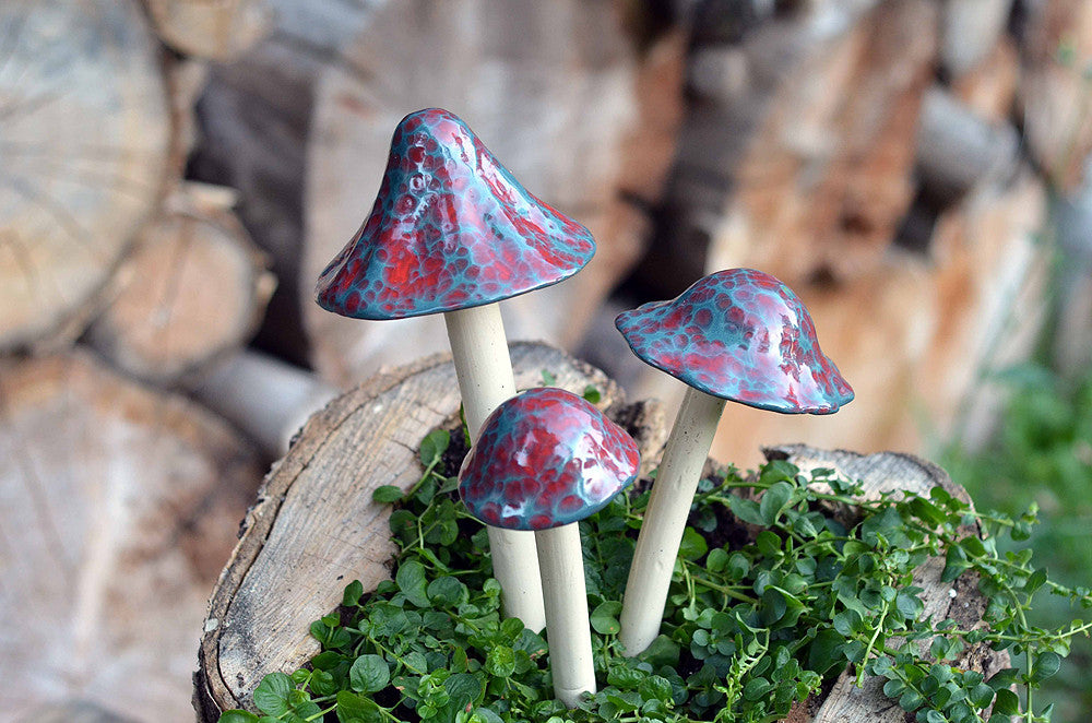 Invite enchantment to your garden with these colorful Shroomyz! Add an instant "pop" of color to your garden or yard! Each ceramic mushroom is individually handcrafted by artisans in Utah - Shroomyz are a product of JJ Potts. Circumference of "caps" varies from 2" - 8" depending on style and size. Will not fade in the sun. Shroomyz are now frost proof and can be left outside all year long!